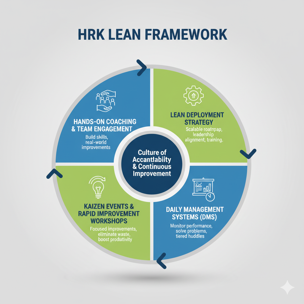 At HRK, we partner with your team to build a lasting lean culture. We help organizations of all sizes apply lean thinking, establish daily management systems, and drive continuous improvement through impactful Kaizen events.